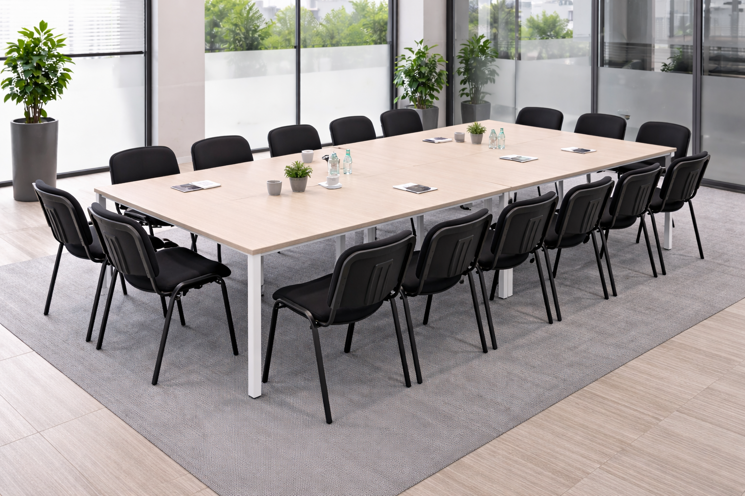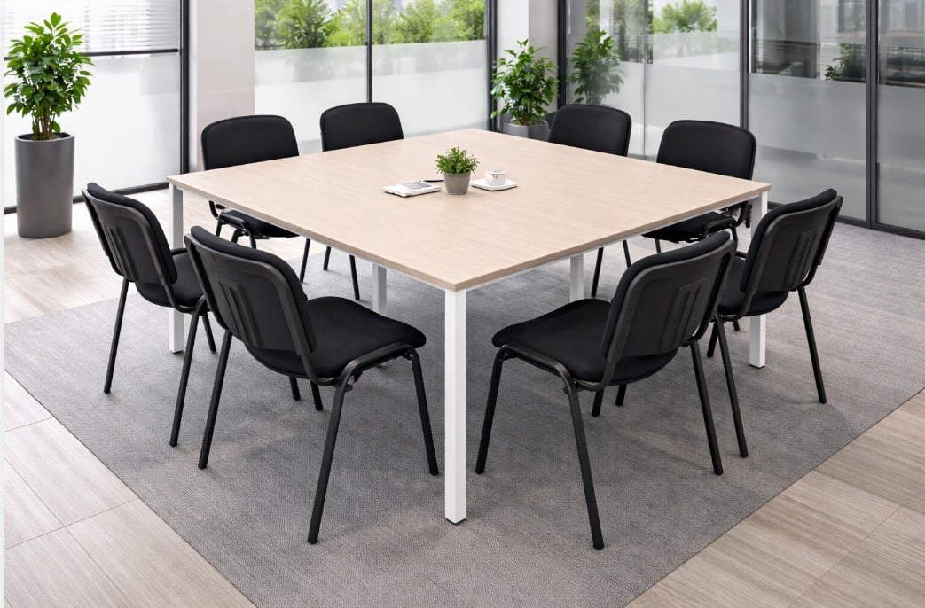 Table de réunion rectangulaire plateau mélamine 160×165 cm – Plateau mélamine 25mm, piétement métallique blanc